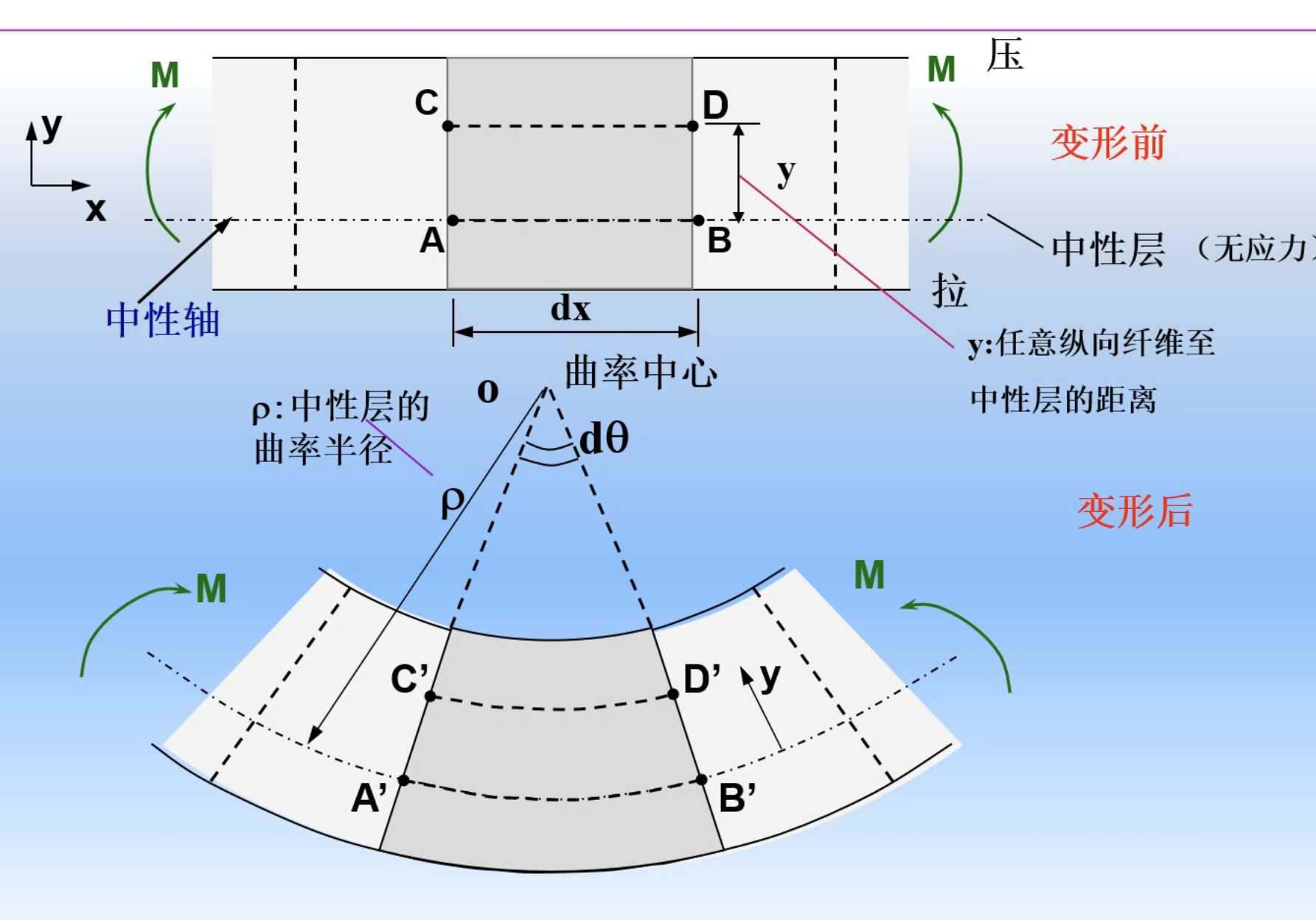 平面截面假设:变形前为平面的梁的横截面,变形后仍为平面,只是绕某轴转动了一个角度,且仍垂直于变形后的梁轴线